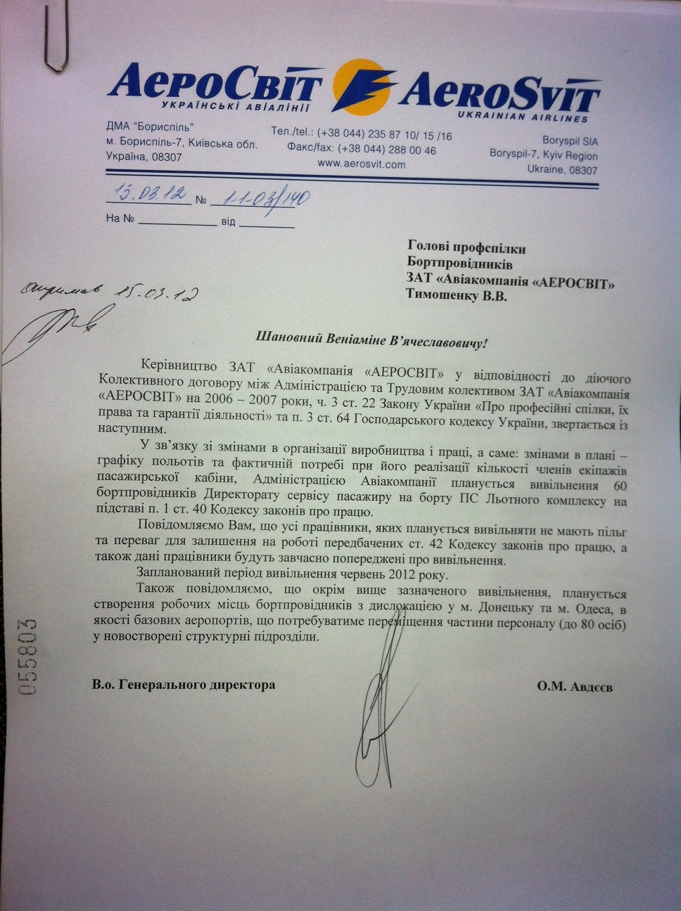 Как уже было сказано в предыдущем сообщении, в компании начинается процедура сокращения штата бортпроводников. Сегодня, 15.03.12 я получил официальное письмо